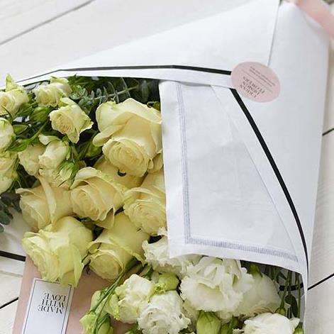 A relaxed collection of lush white flowers in a chic white gift wrap. Beautifully minimal, the lucky person receiving them has creative freedom to arrange them just how they like.