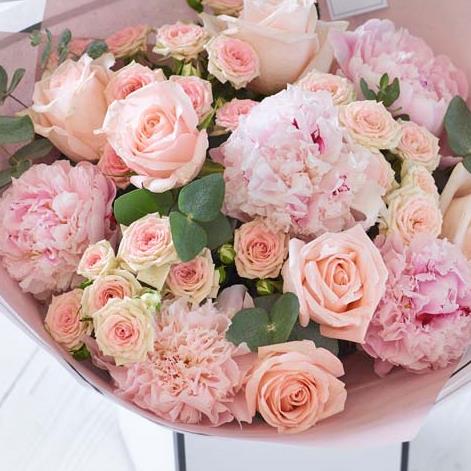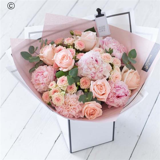 An exquisite bouquet that puts all the attention on the season's showstopper bloom: the peony. It'll feature at least four of these fluffy icons, each expertly picked by the florist for their beauty, then exquisitely arranged with two other co-ordinating types of bloom.