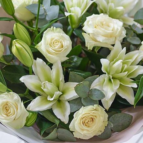 A soothing bouquet of white roses and lilies. Elegant and graceful.