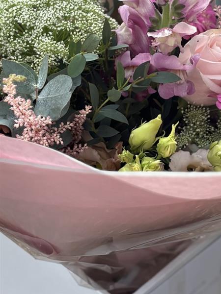 A delicate mix of soft pink roses, alstroemeria, lisianthus, queen anne’s lace, astilbe, and fresh eucalyptus, creating a romantic, garden-style arrangement in gentle blush tones. Perfect for sending love, gratitude, or a touch of elegance.