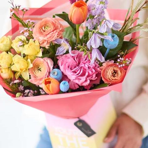 A lovely gift box of fresh flowers, chosen and arranged by the florist. This year our Mother’s Day designs are all about gorgeous pastels with pops of colour. Expect to see shades of baby pink, cream, and lemon with bursts of cerise and tangerine, and highlights of pale blue and lilac.