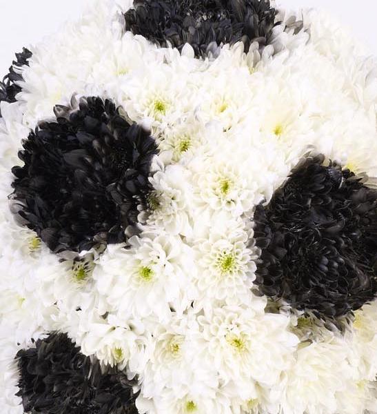 A mass of white double spray chrysanthemums are used in this football-themed three dimensional tribute, with some sprayed black to create the distinctive pattern. The football is then displayed on a moss-covered base.
