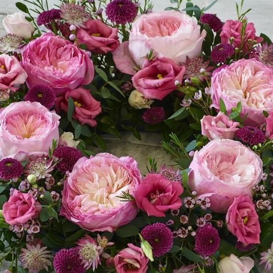 A beautiful wreath of pink tones featuring stunning garden roses, delicate astrantia and elegant foliage.