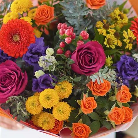 A classic handcrafted bouquet made by a local florist using the freshest blooms and not a single lily. Expect blooms in rich vibrant colours like cerise, fiery orange and sunshine yellow, expertly arranged and shown off in our iconic packaging.