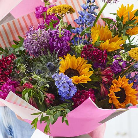 A bouquet that celebrates the beauty of British blooms and features flowers sourced from UK growers*. Full of vibrant hues, expect cerise, reds, fiery orange, pops of blue or yellow plus dried flowers or foliage for texture. Here’s to backing home grown!