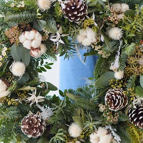 A wreath inspired by the natural beauty of the winter season, handcrafted by a local florist.