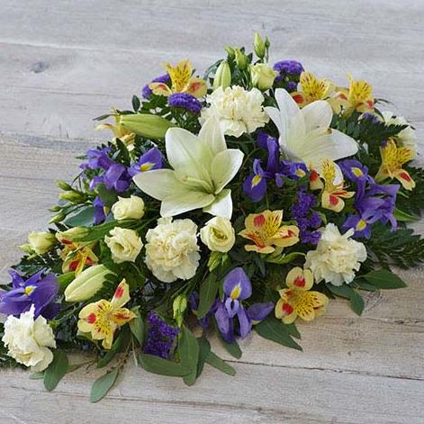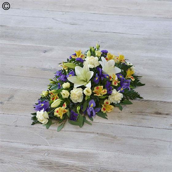One of our most popular designs, this teardrop shaped arrangement features stunning lemon and blue blooms including irises, lisianthus, and alstroemeria.