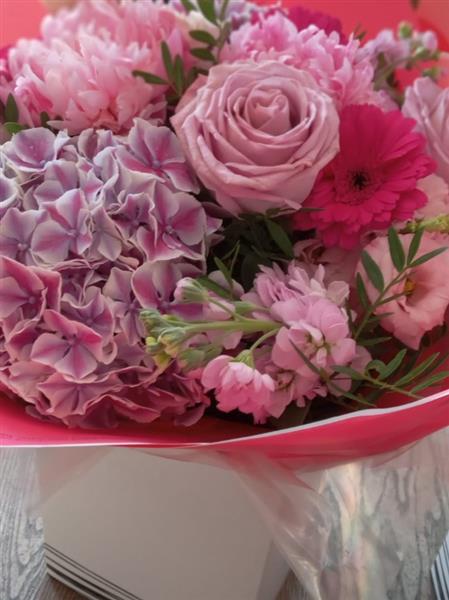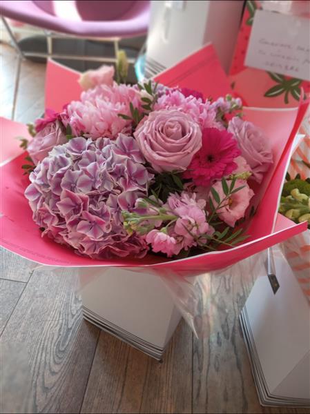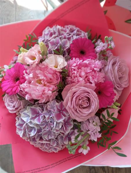 A beautifully feminine mix of pink hydrangea, pastel roses, pink germini, peonies (or peony-style blooms), stock, and soft lisianthus, arranged in layered shades of blush and fuchsia. Full, fluffy textures and dreamy pink tones make this bouquet perfect for celebrations, birthdays, or simply showing love.