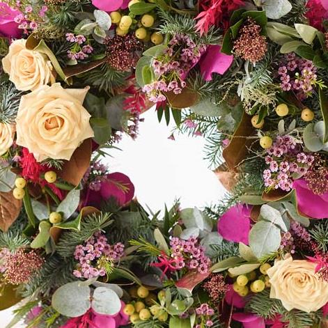 Our biggest fresh flower on trend wreath, this one's a knock out. Arranged by hand in a modern style using the freshest flowers and foliage, it'll feature cerise and purple tones, plus blooms in soft pink, peach or lilac shades. It might also feature dried flowers or foliage painted in copper or rose gold.