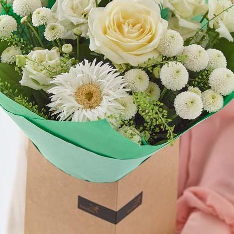 A gift box filled with calming neutral flowers in shades of crisp white and smooth cream, exquisitely arranged with with contrasting fresh green foliage by a local florist.