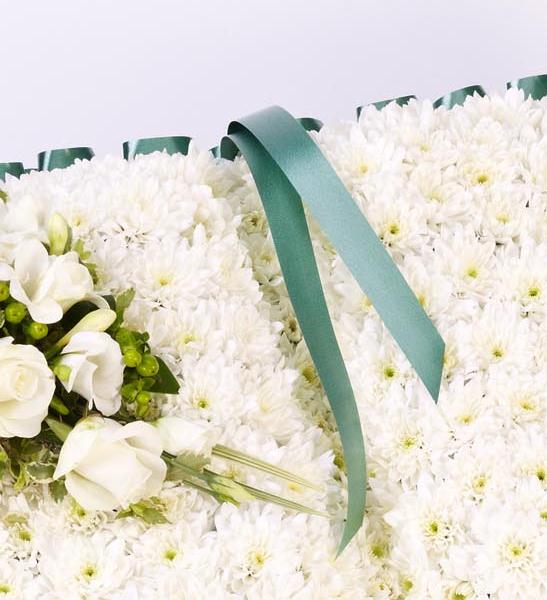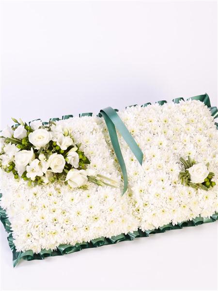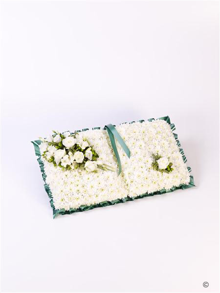 A bed of white double spray chrysanthemums trimmed with ribbon is the basis for this classic open-book floral tribute. The display is finished with carefully arranged white roses, freesia and lisianthus with pittosporum and china grass.