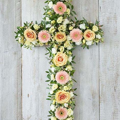 A cross of pretty pastels including peach roses and germini, white carnations and cream lisianthus.