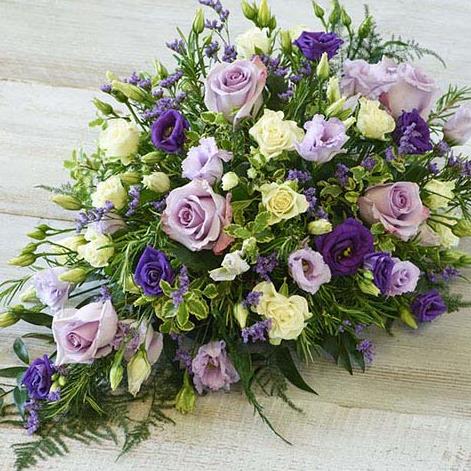 A delicate mix of blooms including roses, lisianthus and scented silvery rosemary. Arranged in a teardrop shape suitable for smaller coffins.