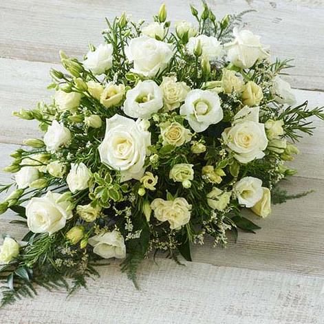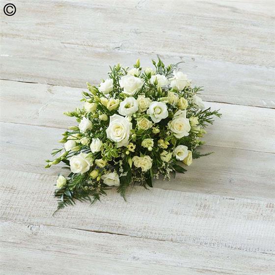 A delicate mix of blooms including roses, lisianthus and scented silvery rosemary. Arranged in a teardrop shape suitable for smaller coffins.