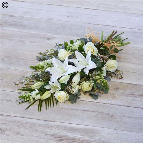 An elegant combination of fresh white tones and rich greens, featuring large ivory roses, oriental lilies, and silvery eucalyptus.