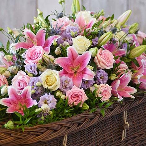 One of our most popular designs, this casket spray is a profusion of pastel blooms including pink and ivory roses and pink oriental lilies.