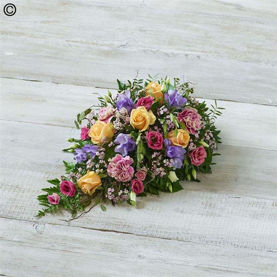 A profusion of fragrant pastel blooms arranged in a teardrop shape. Features scented freesia, peach roses, and natural willow and grass.