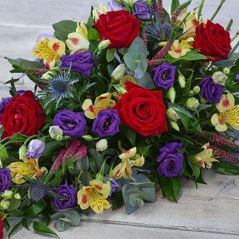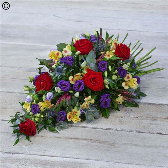 This teardrop shaped arrangement features blooms in a beautiful assortment of colours, including roses, lisianthus and alstroemeria.