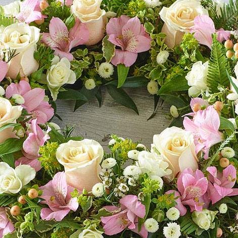 A beautiful pastel mix of soft pink, peach and cream. Featuring roses, chrysanthemums and delicate foliages.