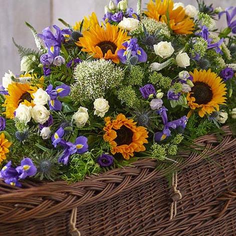 This casket spray is a beautiful summery mix featuring sunflowers, irises, spray roses and lush foliage.