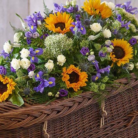This casket spray is a beautiful summery mix featuring sunflowers, irises, spray roses and lush foliage.