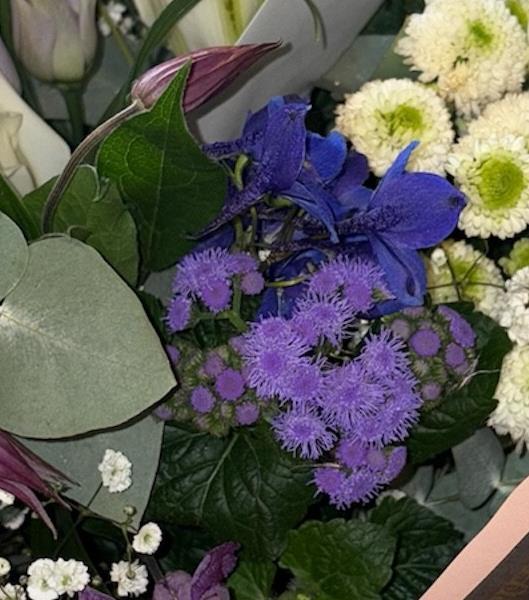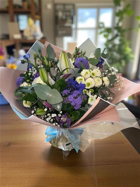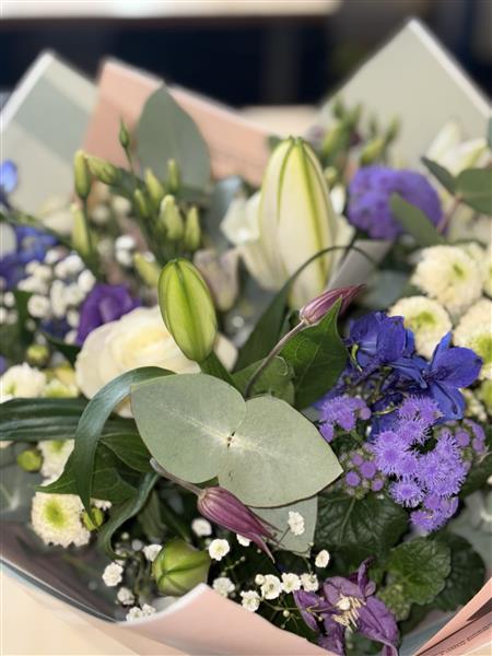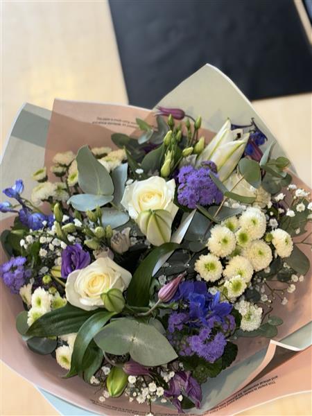 A stylish blend of white lilies, ivory roses, purple seasonal blooms, white chrysanthemums, and delicate gypsophila, complemented by fresh eucalyptus. Soft, elegant tones paired with rich purples create a beautifully balanced, modern arrangement.