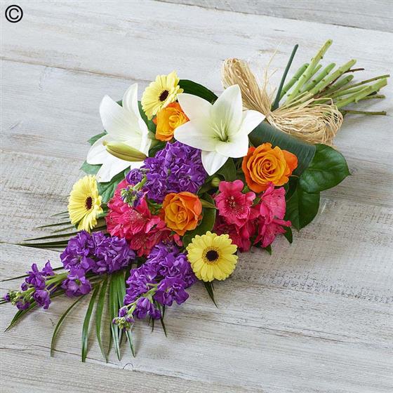 A bright, beautiful and fragrant combination of lilies, roses and stocks. Also featuring alstroemeria and aspidistra.